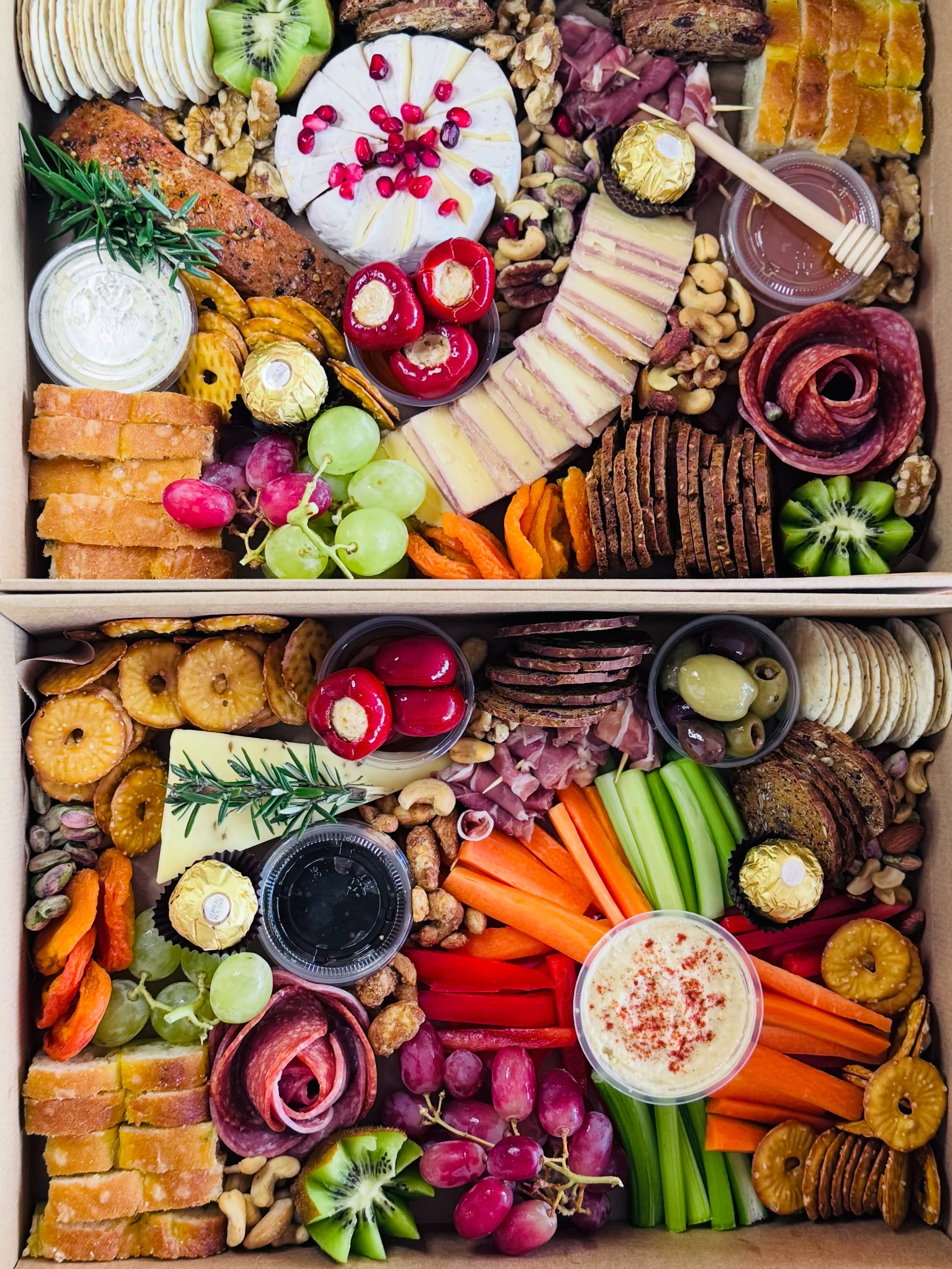 Our boxes are thoughtfully filled with a seasonal mix of fresh produce, flavourful baked goods, charcuterie meats, artisan cheeses, dips, relishes, drizzles, nuts, and other locally sourced delights. We work closely with trusted local retailers to bring you the best of what’s fresh and available. We know you’ll love it—but if there’s anything you’d prefer to leave out, just let us know when ordering.
